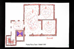 pennarello su fotocopia di carta bianca. Colore: nero, rosa, viola. Soggetto: progetto di pavimento. Disegno firmato e sul verso: "Susy". Scritte: "pianta piano terra - scala 1:100" e, con pennarello rosa, "fragole".