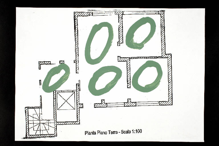 acrilico su fotocopia di carta bianca. Colore: nero, verde oliva. Soggetto: progetto di pavimento. Scritta: "pianta piano terra - scala 1:100".