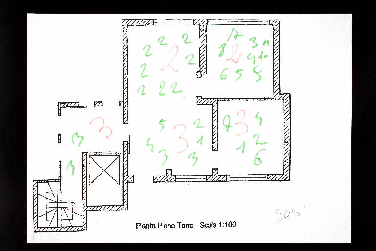 pennarello su fotocopia di carta bianca. Colore: nero, rosa, verde chiaro. Soggetto: progetto di pavimento. Scritta: "pianta piano terra - scala 1:100". Disegno firmato sul recto a matita: "Susi".