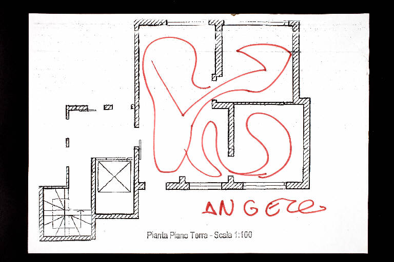 pennarello su fotocopia di carta bianca. Colore: nero, bordeaux. Soggetto: progetto di pavimento. Scritta: "pianta piano terra - scala 1:100". Disegno firmato sul recto con pennarello bordeaux: "Angela".