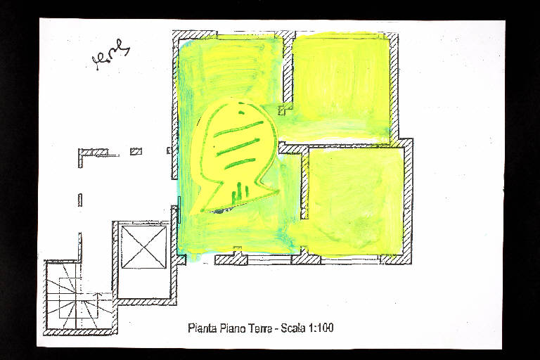 tecnica mista e collage: cartoncino colorato, acrilico e pennarello su fotocopia di carta bianca. Colore: nero, giallo limone, giallo, verde chiaro, blu, verde scuro, terra di Siena naturale chiara. Soggetto: progetto di pavimento. Scritta: "pianta piano terra - scala 1:100". Disegno firmato sul recto con pennarello nero: "Susi".