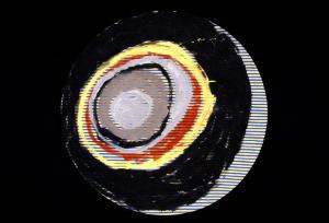 pittura acrilica su stoffa stampata, incollata su truciolare di forma circolare. Colore: giallo, blu, nero, grigio, rosso.
