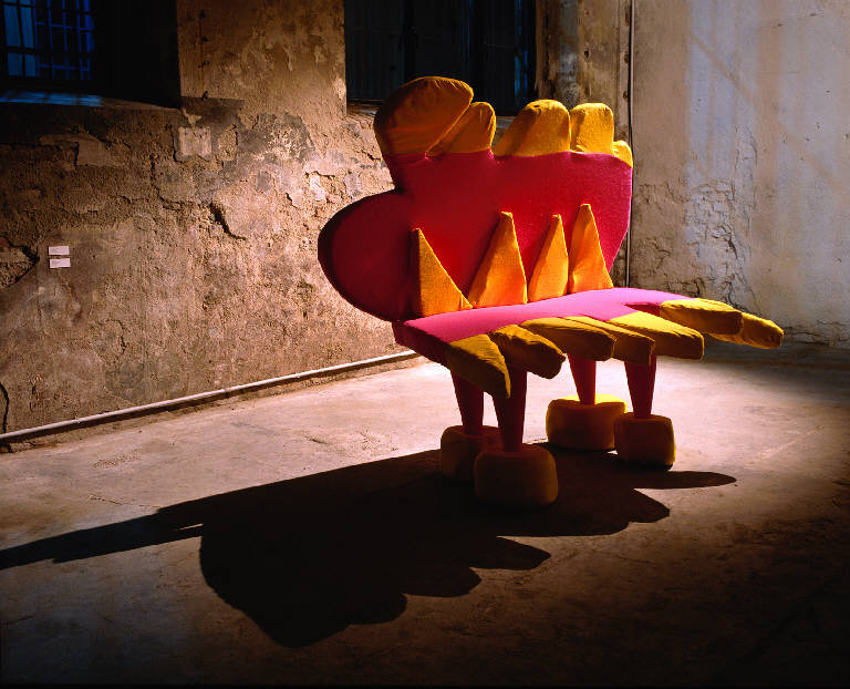 divano costruito con materiali vari: gommapiuma, coni di plastica e pannolenci. Colore: giallo, fucsia.
