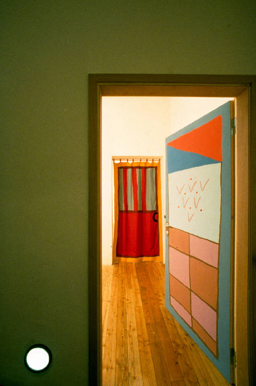 pittura acrilica su legno. Porta dipinta su entrambi i lati. Colore del fronte: ocra scura, arancio, giallo, verde chiaro, bianco. Colore del retro: azzurro, rosa, rosso salmone, blu pastello, blu chiaro, rosso beige. Maniglia in acciaio satinato.