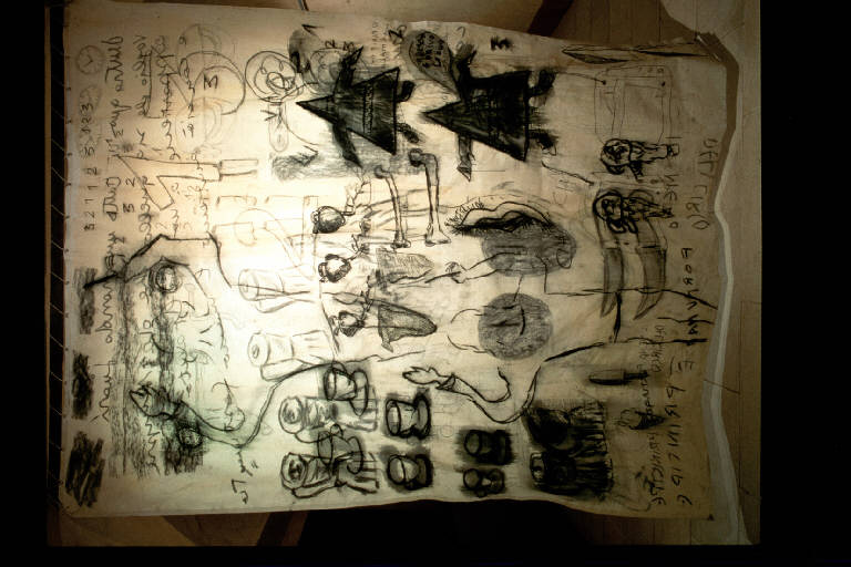 tecnica mista: fusaggine, vernice trasparente opaca, pennarello, su stoffa. Colore: nero, grigio, ocra chiara, bianco.