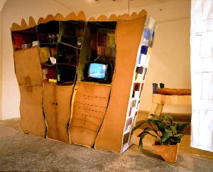 opera composta da quattro parti. Armadio.\nParte frontale\n- materiali strutturali: rete metallica, carta, masonite;\n- componenti: televisore, libri, bicchieri, sveglia, portafotografie;\n- tecnica mista: pittura ad olio, fusaggine;\nColore: marrone, beige chiaro, rosso, verde marcio, giallo, blu, arancio, ocra chiara, ocra scura, verde chiaro, verde beige, marrone beige, blu di Prussia.\nParte laterale destra\n- materiali strutturali: carta, rete metallica e colla;\n- tecnica mista: pittura a olio;\nColore: blu, azzurro, giallo, rosso, grigio, beige, marrone, bianco titanio.\nParte laterale sinistra\n- materiali strutturali: carta, rete metallica e colla;\n- tecnica mista: pittura a olio;\nColore: blu cobalto, azzurro, verde marcio, verde oliva, nero, terra di Siena bruciata, viola, giallo, ocra scura, giallo di Napoli.\nParte posteriore\n- materiali strutturali: rete metallica, carta, carta, rete metallica e colla;\n- tecnica mista: pittura a olio;\nColore: verde chiaro, verde scuro, rosso, giallo di Napoli, terra di Siena bruciata, marrone, verde marcio, verde oliva, grigio, nero, blu scuro, blu oltremare chiaro, verde pallido, rosa, giallo, arancio chiaro, beige chiaro, beige scuro, azzurro, blu genziana, viola, blu di Prussia, verde smeraldo.