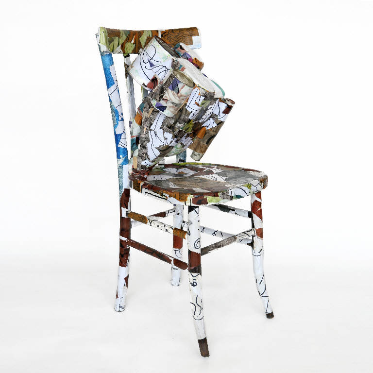 oggetto sonoro costruito con una sedia.\nMateriale di supporto: sedia di legno.\nComponenti: barattoli di latta e flaconi di plastica.\nTecnica mista e collage: carta da pacco, carte colorate, carta bianca, colla vinilica, pennarello.\nColore: bianco, ocra scura e chiara, arancio, azzurro, nero, terra di Siena bruciata, marrone ocra, marrone oliva, grigio, verde, avorio, beige, verde.