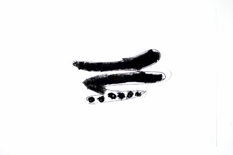 tecnica mista: pennarello e pastello a olio su carta bianca, ritagliata. Colore: nero. Soggetto: studio/bozzetto per tappeto.