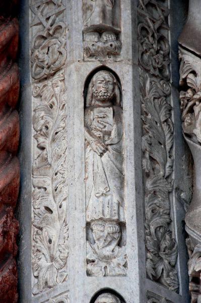 Formella in marmo bianco di Musso scolpito: racchiude entro nicchia archiacuta una figura di apostolo.