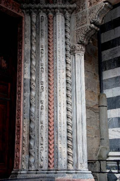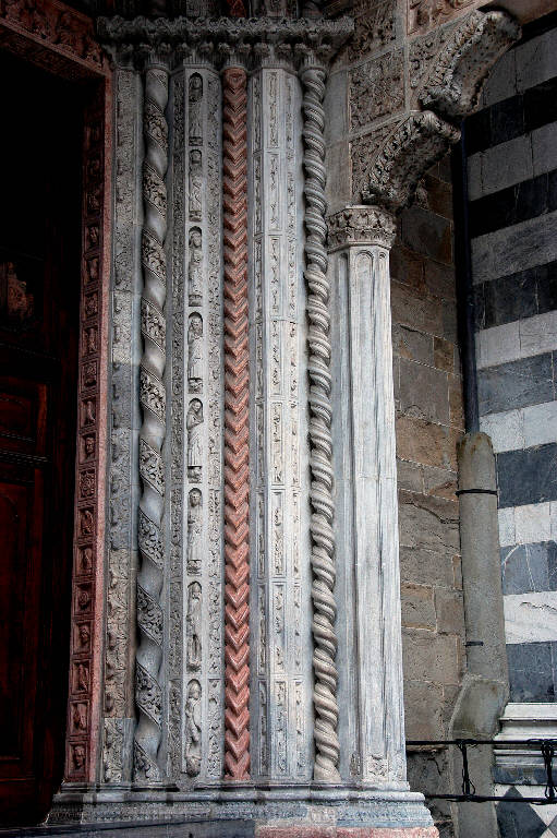 Semipilastro del portale in marmo bianco di Musso, scolpito a formelle rettangolari allungate che racchiudono figure di animali e pastori.
