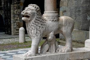 - NOTIZIE STORICO CRITICHE Il leone, come il compagno posto a destra, è stato eseguito tra il 1350 e il 1360 circa dalla bottega di Giovanni da Campione che, per questo particolare iconografico, segue alla lettera il modello dei protiri dell'antica tradizione romanica lombarda, spesso introdotti da figure simili di leone i funzione di avvertimento al visitatore e di simbolica difesa del luogo sacro.\nL'opera è stata restaurata tra il 1999 e il 2000 (Buonincontri, 2005, p. 248).