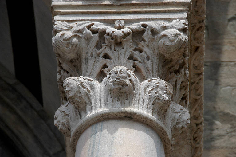 Capitello di colonna in marmo bianco scolpito; motivo decorativo a foglie d'acanto arricciate e giro di testine virili all'ordine inferiore.