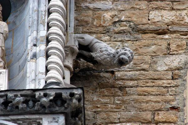 Doccione in marmo bianco scolpito con figura di leone.