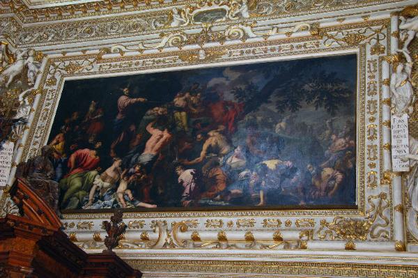 - NOTIZIE STORICO CRITICHE Non c'è nei documenti contabili della Congregazione della Misericordia Maggiore, una menzione esplicita della grande cornice che racchiude il "Mosè fa scaturire l'acqua dalla roccia" di Antonio Zanchi: a mio avviso, la data del dipinto (1669), potrebbe fornire il termine ante quem per l'esecuzione degli stucchi, mentre il termine post quem potrebbe essere fissato al 1659, l'anno in cui Giovanni Angelo e Gerolamo Sala cominciano i lavori per la decorazione del transetto sinistro.