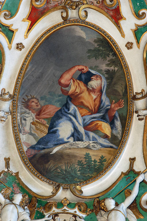 - NOTIZIE STORICO CRITICHE L'affresco, che racconta un episodio della vita del profeta Elia (Libro dei Re III, 18, 41) , fu dipinto da Ciro Ferri tra il 1666 e il 1667, come gli altri che ornano la volta della prima campata (Noris, in "I pittori bergamaschi...Il Seicento", vol. IV, pp. 122-127; p. 166, scheda 10). \nL'opera è stata restaurata nel 1960 da Franco Steffanoni (cfr. "Relazione sui lavori di restauro eseguiti ai dipinti della Basilica di Santa Maria Maggiore per incarico dell'E.C.A. di Bergamo", 24 maggio 1961, protoc. 1232, cat. 5, clas. 6, fasc. 17, Archivio Congregazione Misericordia Maggiore, Bergamo).