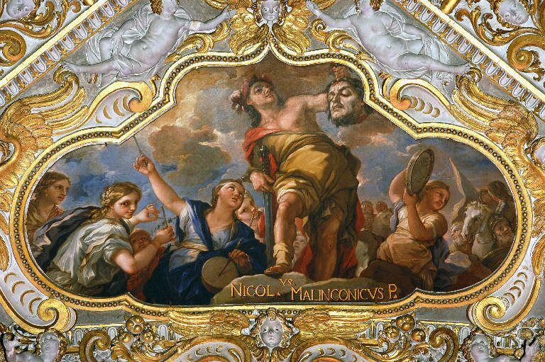 - NOTIZIE STORICO CRITICHE Il dipinto, che racconta il celebre episodio biblico del trionfo di David sul gigante Golia (Libro dei Re, 18), fu eseguito da Nicolò Malinconico trail 1693 e il 1694, com tutti gli altri che ornano la volta della prima campata della navata centrale (Noris, in "I pittori bergamschi...Il Seicento", vol. IV, pp. 167-168, scheda 12).\nL'opera è stata restaurata nel 1959 da Franco Steffanoni (cfr. relazione in data 9 settembre 1959, protoc. 1735, cat. MM, clas. IV, fasc. 5/c, Archivio Congregazione Misericordia Maggiore, Bergamo).
