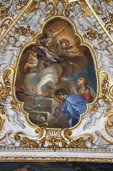 - NOTIZIE STORICO CRITICHE Il dipinto illustra l'episodio narrato nel libro dei Giudici (14): Manoach e la moglie, i futuri genitori di Sansone, sacrificarono un capretto al Signore per implorare la grazia di un figlio e, avuta la visione di un angelo in fiamme, si prostrarono ai piedi dell'altare . La tela fu eseguita da Nicolò Malinconico tra il 1693 e il 1694, come tutte le altre che ornano la volta della seconda campata della navata centrale (Noris, in "I pittori bergamschi...Il Seicento", vol. IV, pp. 167-168, scheda 12).\nL'opera è stata restaurata nel 1959 da Franco Steffanoni (cfr. relazione in data 9 settembre 1959, protoc. 1735, cat. MM, clas. IV, fasc. 5/c, Archivio Congregazione Misericordia Maggiore, Bergamo).
