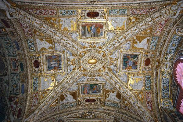 Volta della prima campata della navata laterale destra: lo spazio è diviso in quattro vele da fasce decorative ornate da un motivo a nastro interrotto da fiori e concluso da una testina d'angelo; all'interno delle vele, al centro, entro cornici sormontate da angioletti, riquadri a fresco con episodi della vita della Vergine e, ai lati, riquadri a fondo dorato con figurine di Virtù teologali e cardinali (Fede, Speranza, Carità; Prudenza, Temperanza, Giustizia, Fortezza) e una piccola Sibilla con tavoletta in stucco bianco; nella fascia inferiore di ogni vela, rettangoli con motivi a girali e, al centr, cartigli con piccolo affresco a monocromo.