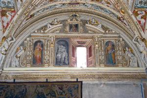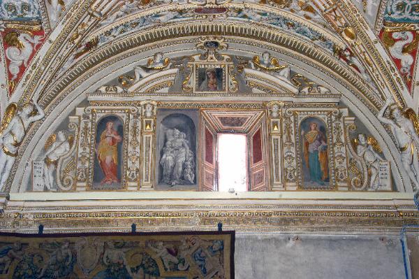Decorazione della lunetta della seconda campata: una struttura architravata, sormontata da elementi ricurvi di timpano spezzato su cui siedono due angeli con cartigli, forma il lato superiore della cornice dei tre affreschi (una figua allegorica femminile, la "Carità" a monocromo e una figura di santa martire) posti a lato della finestra; ai lati, gli elementi verticali che separano gli affreschi sono ornati da motivi a candelabra e da lesene sormontate da testine femminili; alle due estremità, poggiati su volute, due angeli reggono tavolette con iscrzioni in caratteri che arieggiano l'ebraico; in alto al centro, tra gli elementi spezzati del timpano, una cornice a volute racchiude un piccolo affresco con il volto della Madonna.