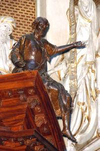 - NOTIZIE STORICO CRITICHE La statua, come l'intero complesso della bussola d'ingresso al transetto destro, fu realizzata dall'intagliatore bergamasco Giuseppe Alari verso il 1770 (Pinetti, 1931, p. 87; Zanchi, 2003, p. 387); è stata restaurata nel 1998 (cfr. relazione tecnica in data 13 maggio 1998, prot. 1821, cat. 5, clas. 6, fasc. 17, Archivio Congregazione Misericordia Maggiore, Bergamo).
