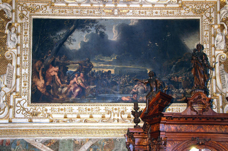 - NOTIZIE STORICO CRITICHE Non c'è, nei documenti contabili della Basilica, una menzione esplicita della grande cornice che racchiude il "Diluvio Universale" di Pietro Liberi: a mio avviso, la data del dipinto (1661), potrebbe fornire il termine ante quem per l'esecuzione degli stucchi, mentre il termine post quem potrebbe essere fissato al 1652, l'anno in cui Giovanni Angelo e Gerolamo Sala cominciano i lavori per la decorazione del transetto destro.