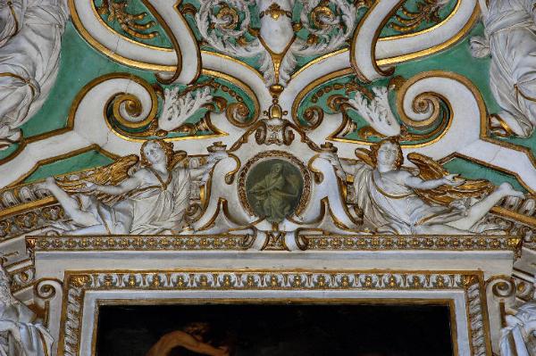 Coppia di angioletti che regge un cartiglio in stucco posto a cornice di una piccola figura virile con turibolo, dipinta a monocromo.