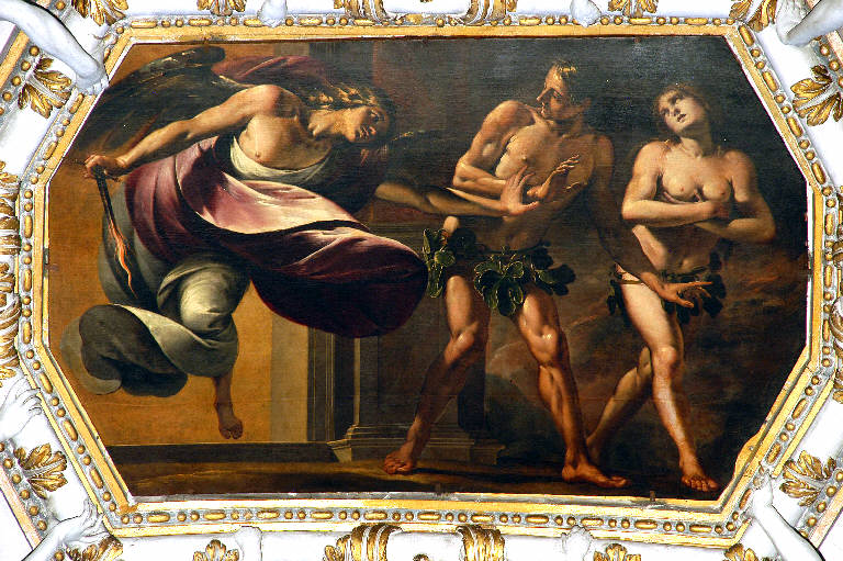 - NOTIZIE STORICO CRITICHE Il dipinto, che racconta l'episodio della "Cacciata di Adamo ed Eva dal Paradiso Terrestre" (Genesi, 3,8-24), è stato eseguito da Giovan Paolo Recchi. Nei libri contabili della Misericordia Maggiore, infatti, un appunto datato 2 agosto 1659 riferisce che al pittore di Como Giovan Paolo Recchi sono dovute £ 589 "per la mercede di due quadri uno di Adamo ed Heva quando furono cacciati di S. Paradiso et altro di Mosè quando li compare il Rovetto acciso" (Noris, in "I pittori bergamaschi...Il Seicento", vol. IV, p. 166, scheda 9). Resta ancora da chiarire la vicenda misteriosa di una seconda redazione dell'"Adamo ed Eva" dipinta nello stesso anno 1659 dall'ignoto pittore perugino Giorgio Marinelli, e forse venduta nel 1692 dalla MIA (Noris, cit.). \nL'opera è stata probabilmente restaurata da Franco Steffanoni nel 1960; nella relazione in data 24 maggio 1961, si accenna infatti alle operazioni eseguite su "10 dipinti su tela" posti nella navata meridionale, non elencati singolarmente, forse da identificare con quelli collocati sulle volte e sulle pareti del braccio meridionale del transetto (doc. in data 24 maggio 1961, prot. 1232, cat. 5, clas. 6, fasc. 17, Archivio Congregazione Misericordia Maggiore, Bergamo).