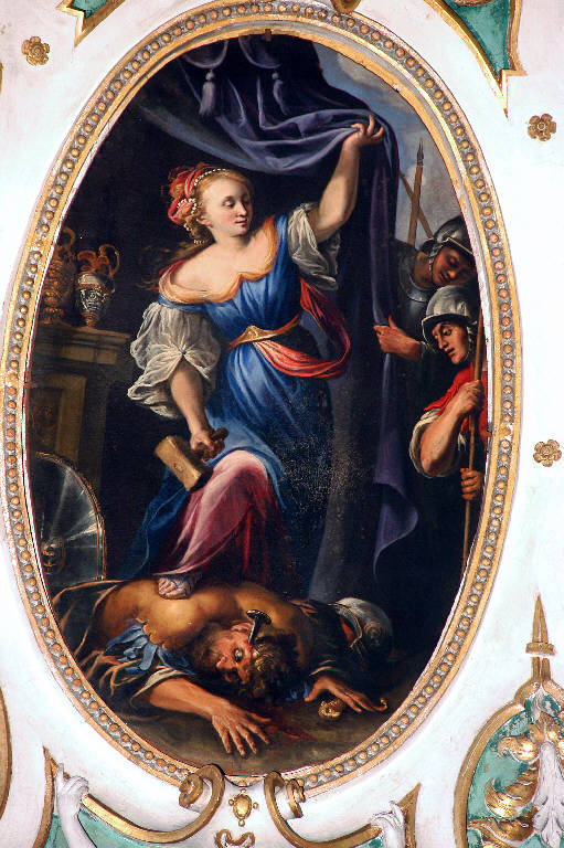 - NOTIZIE STORICO CRITICHE Il dipinto è dedicato all'episodio biblico di "Giaele e Sisara", narrato nel libro di Giudici (4, 8-22): Giaele, moglie di Eber, offre rifugio nella sua tenda a Sisara generale di Iabin, sconfitto dagli Israeliti e in fuga con i suoi soldati; la donna gli dà del latte da bere, lo nasconde sotto una coperta e attende che sia addormentato; poi lo uccide con un piolo ed un martello, realizzando così l'annuncio della profetessa Debora. Il quadro, eseguito probabilmente nel 1660, come informa la data segnata sul vaso d'argento a sinistra, fu pagato "10 doppe" al pittore cremonese Giovanni Battista Natali il 19 gennaio 1661 (Noris, in "I pittori bergamaschi...Il Seicento", vol. IV, pp. 165-166, scheda 9). \nL'opera è stata probabilmente restaurata da Franco Steffanoni nel 1960; nella relazione in data 24 maggio 1961, si accenna infatti alle operazioni eseguite su "10 dipinti su tela" posti nella navata meridionale, non elencati singolarmente, forse da identificare con quelli collocati sulle volte e sulle pareti del braccio meridionale del transetto (doc. in data 24 maggio 1961, prot. 1232, cat. 5, clas. 6, fasc. 17, Archivio Congregazione Misericordia Maggiore, Bergamo).