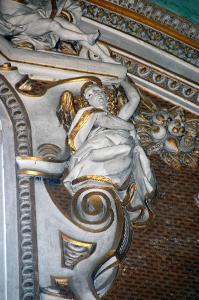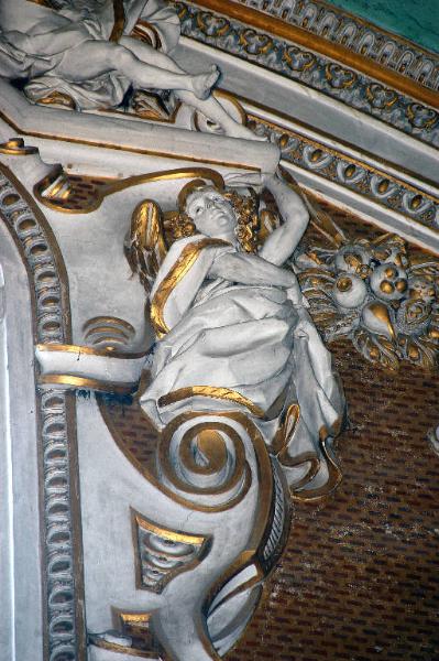 Figura di angelo in funzione di cariatide, con il braccio sinistro alzato e il destro piegato, poggiante su mensola con motivo a voluta.