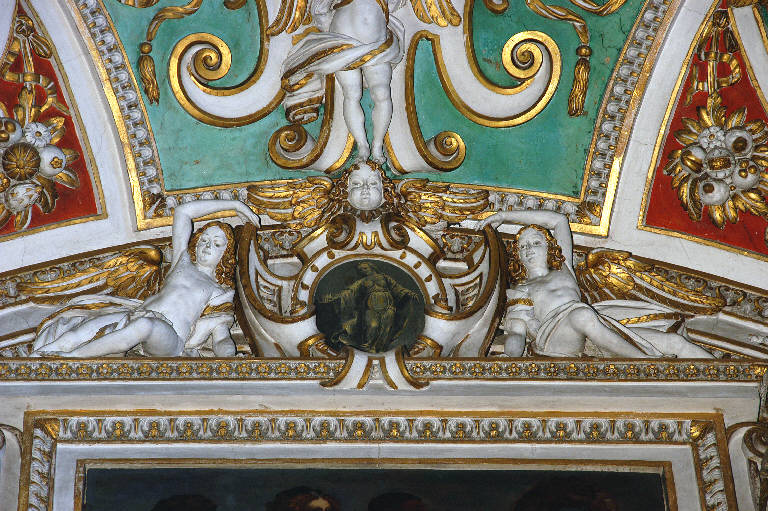 Coppia di angioletti che regge un cartiglio in stucco a volute, sormontato da una testina d'angelo, posto a cornice di una piccola figura femminile, dipinta a monocromo.