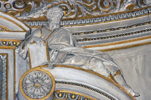 - NOTIZIE STORICO CRITICHE La scultura, che si contrappone ad un'altra fgura di Profeta ad essa simmetrica sull'altro spiovente del timpano, è stata realizzata, come l'intera ancona, da Francesco e Lorenzo Porta, stuccatori originari di Osteno, sul lago di Lugano, nel 1584: nei patti firmati con i deputati della Misericordia Maggiore il 23 febbraio di quell'anno, i Porta si impegnarono a seguire, per l'intera decorazione della cappella del SS. Sacramento, "...il modello fatto per ms Martin Basso e Franc. Brembilla". Con ogni probabilità, il lavoro fu eseguito in gran parte dal solo Lorenzo Porta: il nome di Francesco, infatti, scompare già a partire dal primo pagamento, datato 4 giugno 1584 (Cortesi Bosco, in "I pittori bergamaschi...Il Seicento", vol. II, pp. 92-94, nota 5).