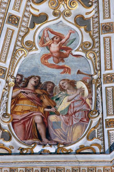 - NOTIZIE STORICO CRITICHE Il riquadro con figure di angeli è stato eseguito tra il 1615 e il 1616 da Giovan Paolo Cavagna (L. Bandera, in "I pittori bergamaschi...Il Cinquecento", vol. IV, p. 136 e pp. 180-181, schede 25-27) . Ruggeri ha proposto di identificare questo gruppo di angeli con quello che, secondo i documenti, Enea Salmeggia avrebbe eseguito nella cupola prima di abbandonare il cantiere (Ruggeri, in "I pittori bergamaschi...", cit., p. 300, scheda 25). \nL'opera è stata restaurata nel 1961 da Franco Steffanoni (cfr. doc. in data 5/ 12/ 1961, protoc. 2579, pratica 4643, cart. 89, Archivio Congregazione Misericordia Maggiore, Bergamo).