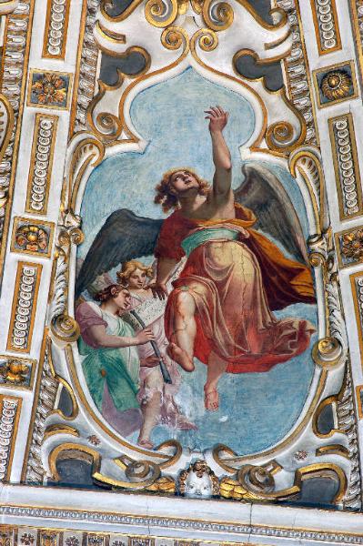 - NOTIZIE STORICO CRITICHE Il riquadro con figure di angeli è stato eseguito tra il 1615 e il 1616 da Giovan Paolo Cavagna (L. Bandera, in "I pittori bergamaschi...Il Cinquecento", vol. IV, p. 136 e pp. 180-181, schede 25-27).\nL'opera è stata restaurata nel 1961 da Franco Steffanoni (cfr. doc. in data 5/ 12/ 1961, protoc. 2579, pratica 4643, cart. 89, Archivio Congregazione Misericordia Maggiore, Bergamo).