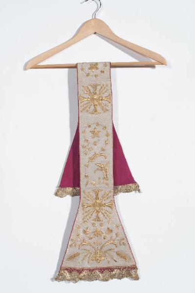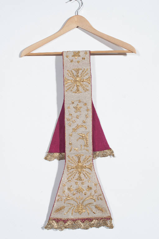 - NOTIZIE STORICO CRITICHE Il manipolo è la prima delle insegne liturgiche, proprie del suddiacono, ora non più in uso. Si tratta di una stretta benda di stoffa, dello stesso colore della pianeta, che veniva portata sull'avambraccio sinistro e fermata ad esso attraverso due nastri. Solitamente era decorato da croci e poteva avere varie forme: la più in uso era quella che lo vedeva dotato di due terminazioni leggermente trapezoidali, munite di frange. I tre manipoli in esame, appartenenti ad un paramento liturgico, sono realizzati in cannellato ovvero in un'armatura derivata dal teffetas caratterizzata da coste orizzontali. Il ricamo, eseguito in oro filato e oro laminato con l'applicazione di paillettes, presenta una decorazione di chiara ascendenza francese molto in voga nel XIX secolo. Questa moda, diffusa anche in Italia, vedeva la presenza di molti elementi decorativi desunti dal repertorio classico quali l'acanto, le volute, i tralci fioriti, uniti ad altri propri del gusto rocaille. In alcuni casi, oltre ad elementi vegetali, si potevano trovare vasi a decori geometrici ricolmi di fiori ed eleganti anfore ansate.