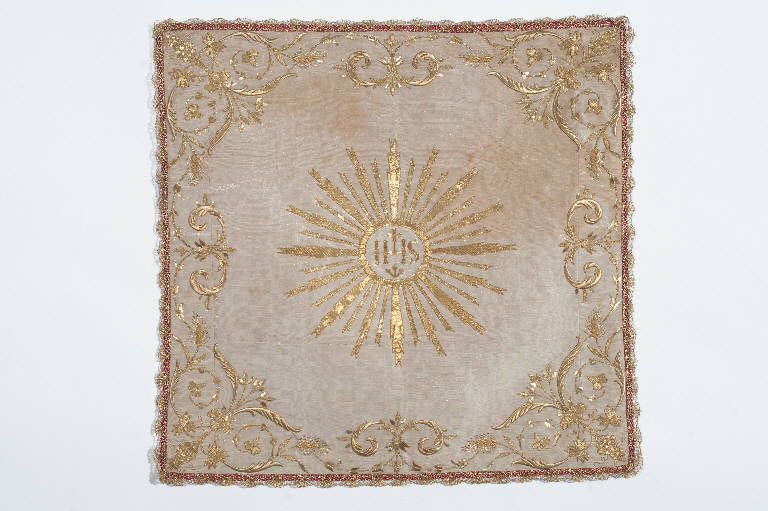 - NOTIZIE STORICO CRITICHE Si tratta di un riquadro di stoffa dello stesso tessuto e dello stesso colore degli altri elementi del paramento liturgico che serve per coprire il calice all'inizio e alla fine della messa. Al centro vi possono essere la croce o il monogramma cristologico. Il vero e proprio velo di calice risale al XVI secolo quando venne prescritto dal messale di Pio V (1570) che lo cita esplicitamente tra gli accessori indispensabili alla celebrazione della messa. Il velo in esame, appartenente ad un paramento liturgico, è realizzato in cannellato ovvero in un'armatura derivata dal teffetas caratterizzata da coste orizzontali. Il ricamo, eseguito in oro filato e oro laminato con l'applicazione di paillettes, presenta una decorazione di chiara ascendenza francese molto in voga nel XIX secolo. Questa moda, diffusa anche in Italia, vedeva la presenza di molti elementi decorativi desunti dal repertorio classico quali l'acanto, le volute, i tralci fioriti, uniti ad altri propri del gusto rocaille. In alcuni casi, oltre ad elementi vegetali, si potevano trovare vasi a decori geometrici ricolmi di fiori ed eleganti anfore ansate.