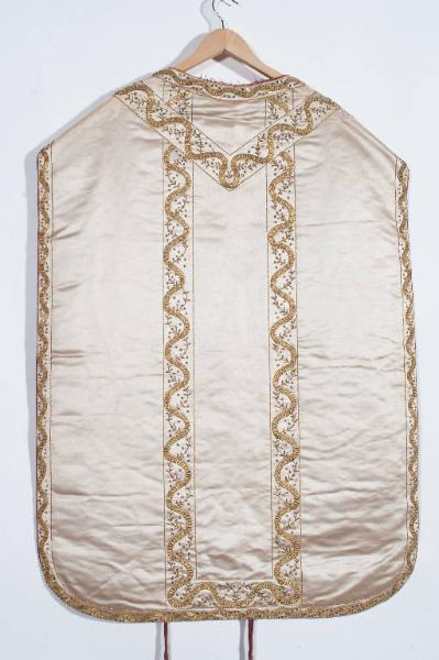 Pianeta in raso bianco. Il ricamo, eseguito in oro filato, oro laminato e canutiglia oro con applicazione di paillettes dorate, è posizionato lungo il perimetro e disegna anche croce e colonna sostituendo visivamente l'applicazione del gallone. Si tratta di un motivo di grande semplicità che presenta lo svolgersi ad "8" di un nastro e una ramificazione con piccole foglie. Fodera in cotone rosso.