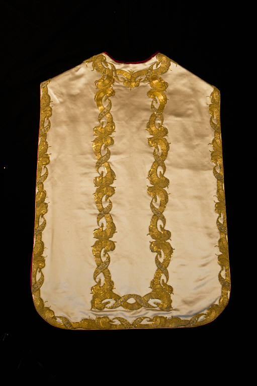 Pianeta in raso bianco. I motivi a riporto, eseguiti in argento laminato, oro filato e canutiglia oro con applicazione di paillettes dorate e borchiette, sono posizionati lungo il perimetro e disegnano anche croce e colonna sostituendo visivamente l'applicazione del gallone. Si tratta di un disegno che presenta lo svolgersi ad "8" di coppie di racemi a voluta d'oro tangenti e speculari. Fodera in gros de Tours di seta rosso.