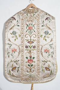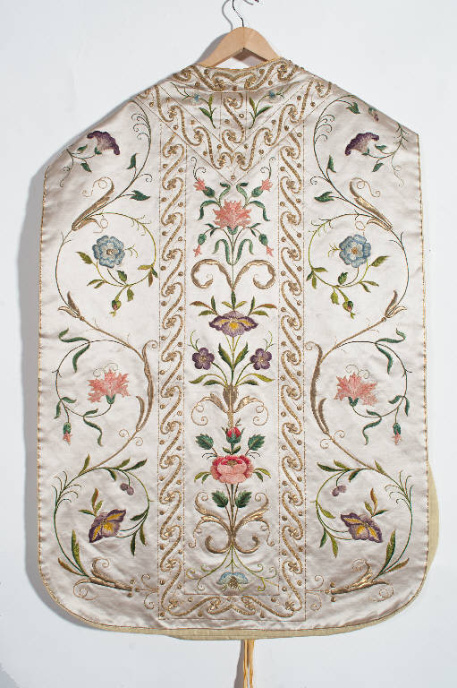 Paramento liturgico in raso bianco. I motivi a riporto, eseguiti in seta, oro filato, oro laminato e canutiglia oro, presentano lo svolgersi di infiorescenze policrome (rose, campanule, viole, margherite e garofani) e tralci d'acanto che si snodano dal basso verso l'alto disegnando eleganti girali con fiori al centro. Il disegno si struttura in maniera speculare rispetto all'asse mediano. Ornano alcuni pezzi del parato galloni eseguti a ricamo in oro filato e oro laminato costituiti da un nastro dall'andamento sinuoso con fiori a quattro petali nei punti di tangenza.