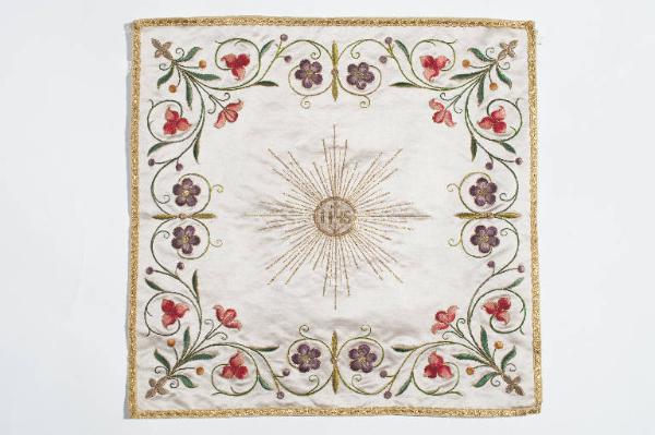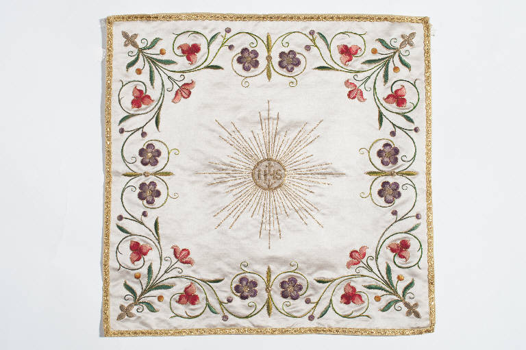 Velo di calice in raso bianco. I motivi a riporto, eseguiti in seta policroma, oro filato, oro laminato e canutiglia oro, presentano tralci d'acanto che si snodano lungo il perimetro disegnando eleganti girali con fiori al centro (primule e margherite). Il disegno si struttura in maniera speculare rispetto all'asse mediano. Al centro l'iscrizione raggiata d'oro IHS. Fodera in Gros de Tours di seta giallo. Il velo è rifinito da piccoli galloni eseguiti a telaio in oro filato e oro laminato.