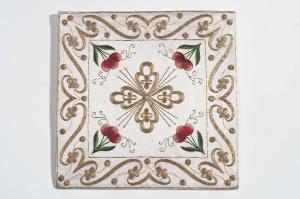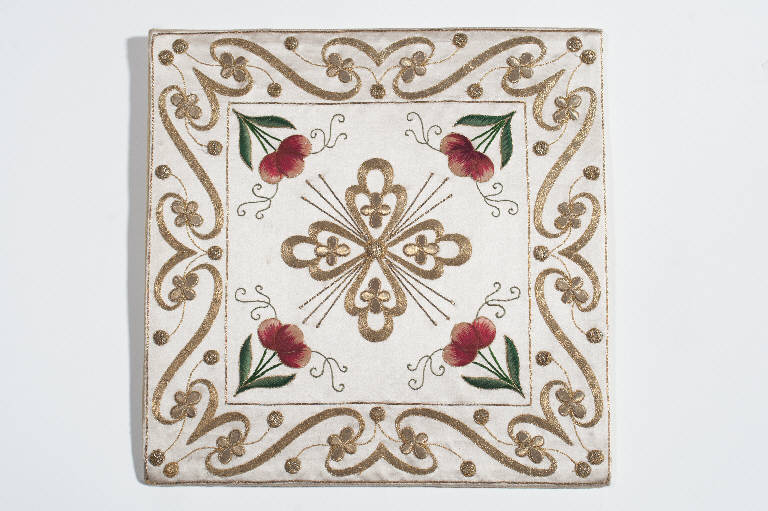 - NOTIZIE STORICO CRITICHE Il velo di calice in esame fa parte di un paramento liturgico. I ricami in seta policroma, oro filato, oro laminato e canutiglia oro sono riportati su un supporto in raso di seta bianco confezionato in epoca recente e sono posizionati lungo il perimetro, dove sostituscono visivamente l'applicazione del gallone, e al centro, dove una croce raggiata con terminazioni trilobe è incorniciata agli angoli da fiori a tre petali. Il disegno, privo sia di infiorescenze policrome che di tralci d'acanto che si snodano disegnando eleganti girali con fiori al centro presenti in altri pezzi del parato, si struttura in maniera speculare rispetto all'asse mediano. L'estrema semplificazione e il rigido tracciato delle volute confermano la datazione della borsa, collocabile alla fine dell'Ottocento, probabilmente realizzato in un laboratorio del territorio locale. Presso il Museo Diocesano di Brescia sono conservati un parato dal ricamo molto simile e il suo disegno preparatorio ("Indue me Domine", 1998, pp. 121, 168-169).