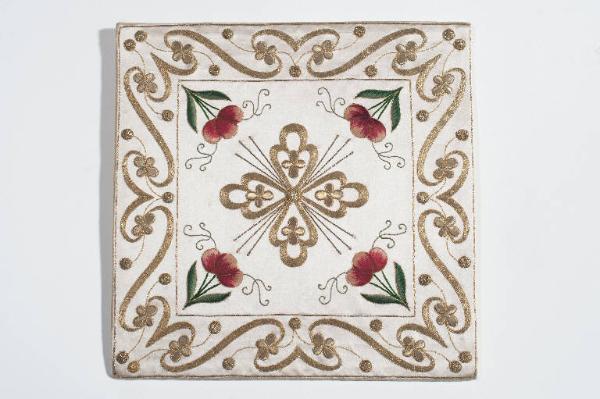 Borsa del corporale in raso bianco. I motivi a riporto, eseguiti in seta policroma, oro filato, oro laminato e canutiglia oro, sono posizionato lungo il perimetro, dove sostituscono visivamente l'applicazione del gallone, e al centro, dove una croce raggiata con terminazioni trilobe è incorniciata agli angoli da fiori a tre petali. Il disegno si struttura in maniera speculare rispetto all'asse mediano. I galloni eseguti a ricamo in oro filato e oro laminato presentano un nastro dall'andamento sinuoso con fiori a quattro petali nei punti di tangenza. Fodera in Gros de Tours di seta giallo.