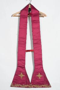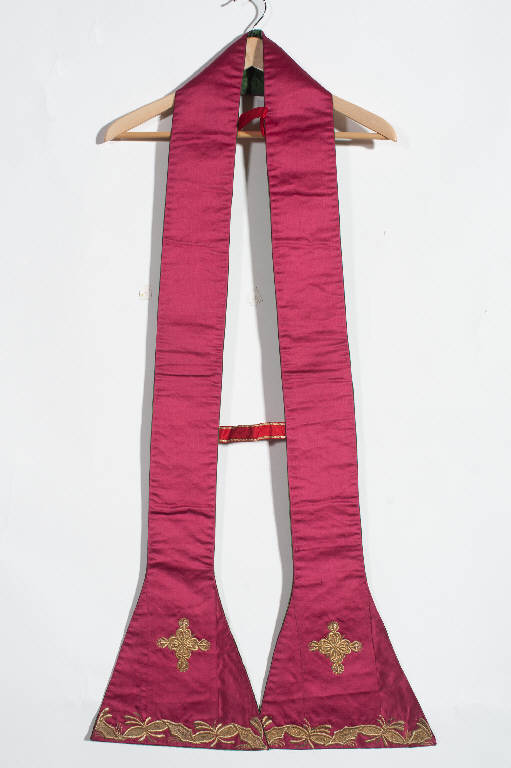 Stola in raso rosso. Il ricamo, eseguito in oro filato con applicazione di paillettes, sostituisce visivamente l'applicazione del gallone. Il disegno, che presenta lo svolgersi di un nastro dall'andamento sinuoso che si intreccia con motivi vegetali, è posizionato nelle terminazioni trapezoidali dotate di croci. Fodera in tessuto di seta verde.