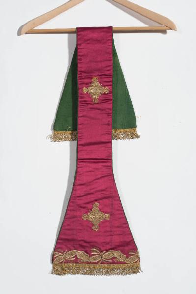 Manipolo in raso rosso. Il ricamo, eseguito in oro filato con applicazione di paillettes, sostituisce visivamente l'applicazione del gallone. Il disegno, che presenta lo svolgersi di un nastro dall'andamento sinuoso che si intreccia con motivi vegetali, è posizionato nelle terminazioni trapezoidali dotate di croci. Fodera in tessuto di seta verde.