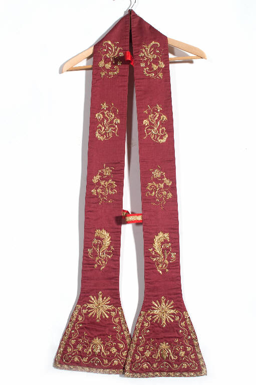 Stola in taffetas. Su di un fondo rosso sono disposti grossi gruppi fioriti ripetuti in verticale per tutta la lunghezza nei quali spiccano tralci fioriti, volute, foglie d'canto e infiorescenze eseguiti in oro laminato e canutiglia oro con applicazione di borchiette e paillettes. Le terminazioni trapezoidali dotate di croci raggiate d'oro sono rifinite da un ricamo dall'andamento ondulato e da galloni in oro filato e oro laminato eseguiti a fuselli. Fodera in taffetas di seta rosso.