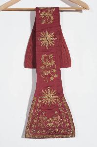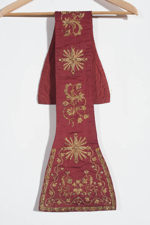 - NOTIZIE STORICO CRITICHE Il manipolo in esame, appartenente ad un paramento liturgico, è in taffetas di colore rosso, ovvero in un tessuto realizzato in seta caratterizzato da un'armatura semplice dalla quale derivano tutte le altre. Il ricamo è eseguito in oro laminato e canutiglia oro con applicazione di borchiette e paillettes. Il disegno, disposto in verticale per tutta la lunghezza, presenta una decorazione di chiara ascendenza francese molto in voga nel XIX secolo. Questa moda, diffusa anche in Italia, vedeva la presenza di molti elementi decorativi desunti dal repertorio classico quali l'acanto, le volute, i tralci fioriti, uniti ad altri propri del gusto rocaille. La disposizione e la tipologia del decoro collocano la datazione del parato, probabilmente realizzato presso un laboratorio locale, nel primo quarto dell'Ottocento.