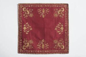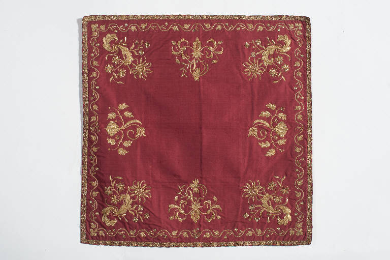 - NOTIZIE STORICO CRITICHE Il velo di calice in esame, appartenente ad un paramento liturgico, è in taffetas di colore rosso, ovvero in un tessuto realizzato in seta caratterizzato da un'armatura semplice dalla quale derivano tutte le altre. Il ricamo è eseguito in oro laminato e canutiglia oro con applicazione di borchiette e paillettes. Il disegno, disposto in verticale lungo tutto il perimetro, presenta una decorazione di chiara ascendenza francese molto in voga nel XIX secolo. Questa moda, diffusa anche in Italia, vedeva la presenza di molti elementi decorativi desunti dal repertorio classico quali l'acanto, le volute, i tralci fioriti, uniti ad altri propri del gusto rocaille. La disposizione e la tipologia del decoro collocano la datazione del parato, probabilmente realizzato presso un laboratorio locale, nel primo quarto dell'Ottocento.
