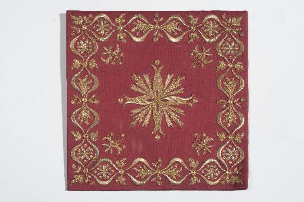 - NOTIZIE STORICO CRITICHE Il manufatto in esame, appartenente ad un paramento liturgico, è in taffetas di colore rosso, ovvero in un tessuto realizzato in seta caratterizzato da un'armatura semplice dalla quale derivano tutte le altre. Lungo tutto il perimentro è presente solo un fregio dorato a medaglioni che incorniciano fiori e foglie eseguito in oro laminato e canutiglia oro con applicazione di borchiette e paillettes. La borsa è priva di quei grossi gruppi fioriti ripetuti in verticale nei quali spiccano tralci fioriti, volute, foglie d'canto e infiorescenze che caratterizzano tutti gli altri pezzi del paramento. Tale disegno presenta una decorazione di chiara ascendenza francese molto in voga nel XIX secolo. Questa moda, diffusa anche in Italia, vedeva la presenza di molti elementi decorativi desunti dal repertorio classico quali l'acanto, le volute, i tralci fioriti, uniti ad altri propri del gusto rocaille. La disposizione e la tipologia del decoro collocano la datazione del parato, probabilmente realizzato presso un laboratorio locale, nel primo quarto dell'Ottocento.