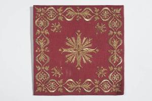 Borsa del corporale in taffetas. Su di un fondo rosso è disposto lungo tutto il perimentro un fregio dorato a medaglioni che incorniciano fiori e foglie eseguito in oro laminato e canutiglia oro con applicazione di borchiette e paillettes. Al centro una croce raggiata d'oro con foglie d'acanto. Fodera in taffetas di seta rosso.