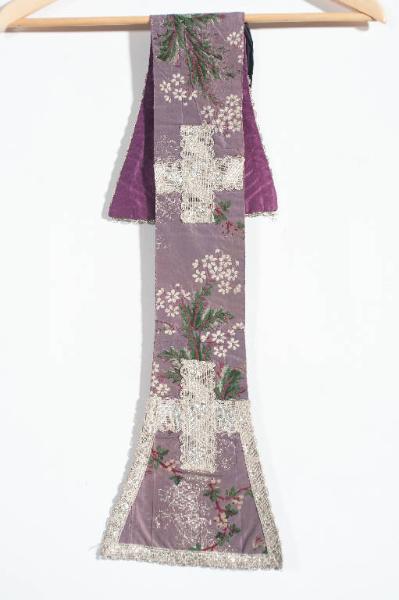 Manipolo in taffetas broccato. Su di un fondo viola un motivo decorativo della tipologia a "meandro" è tracciato dal sinuoso svolgersi in verticale di un nastro argenteo cui si attorciglia una ramificazione con bacche. Nelle anse sono collocati mazzi di piccoli fiorellini bianchi che alternano la direzione. Ornano le terminazioni trapezoidali galloni in argento filato e argento laminato eseguiti a telaio. Fodera in taffetas di seta viola.