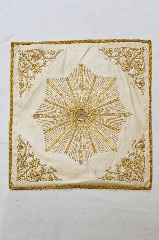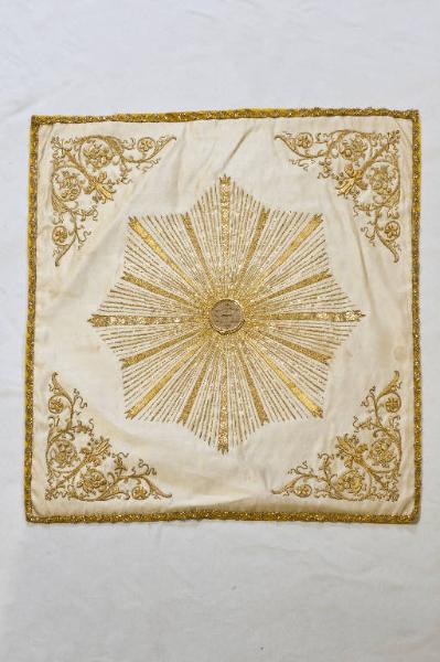 Velo di calice in raso bianco. Il disegno, eseguito a ricamo in oro filato, oro laminato e oro riccio con applicazione di paillettes dorate, è posizionato agli angoli e si snoda con tralci affrontati che allargandosi e ricongiugendosi danno origine a foglie d'acanto, girali terminanti in corolle fiorite e volute. Al centro l'iscrizione raggiata d'oro IHS. Galloni in oro filato e oro laminato eseguiti a fuselli. Fodera in tessuto di seta gialla.